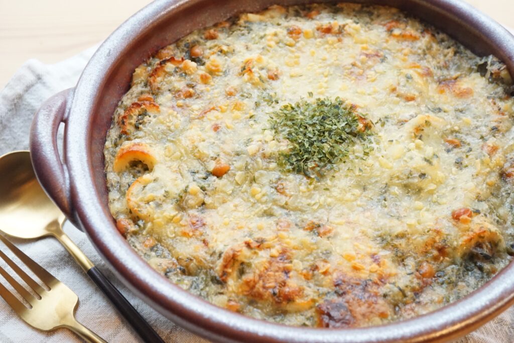 長芋とちくわの納豆磯辺グラタンは、旦那さんも息子たちにも大好評!わたしは最近ハマってる、veganチーズで作ってみました。