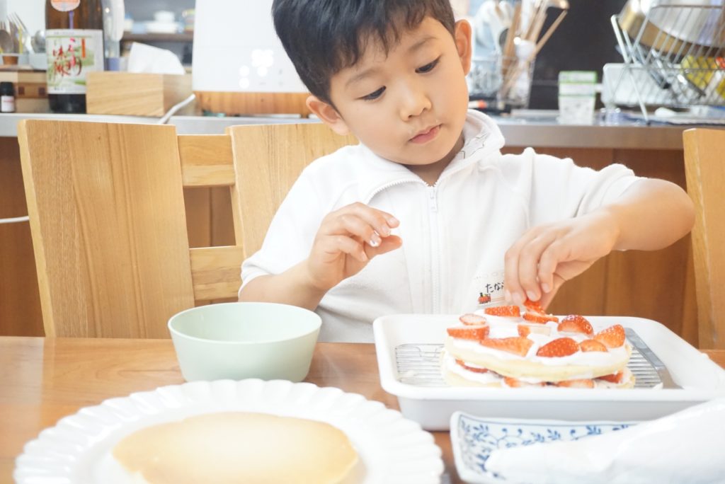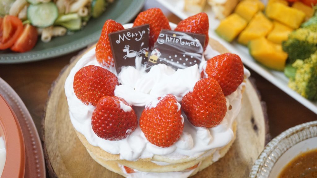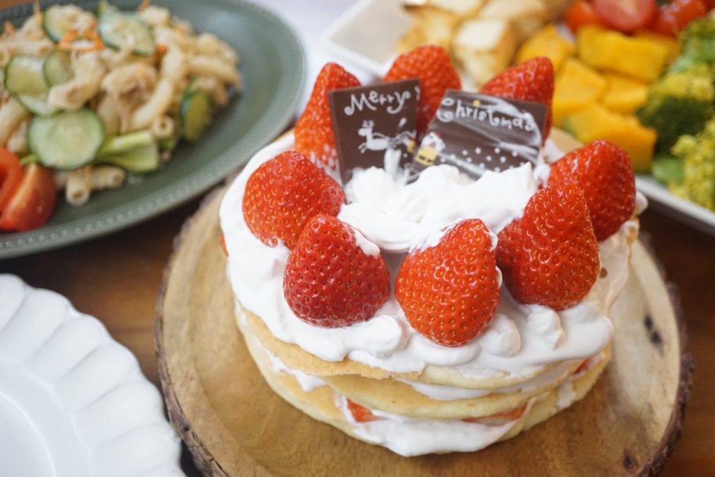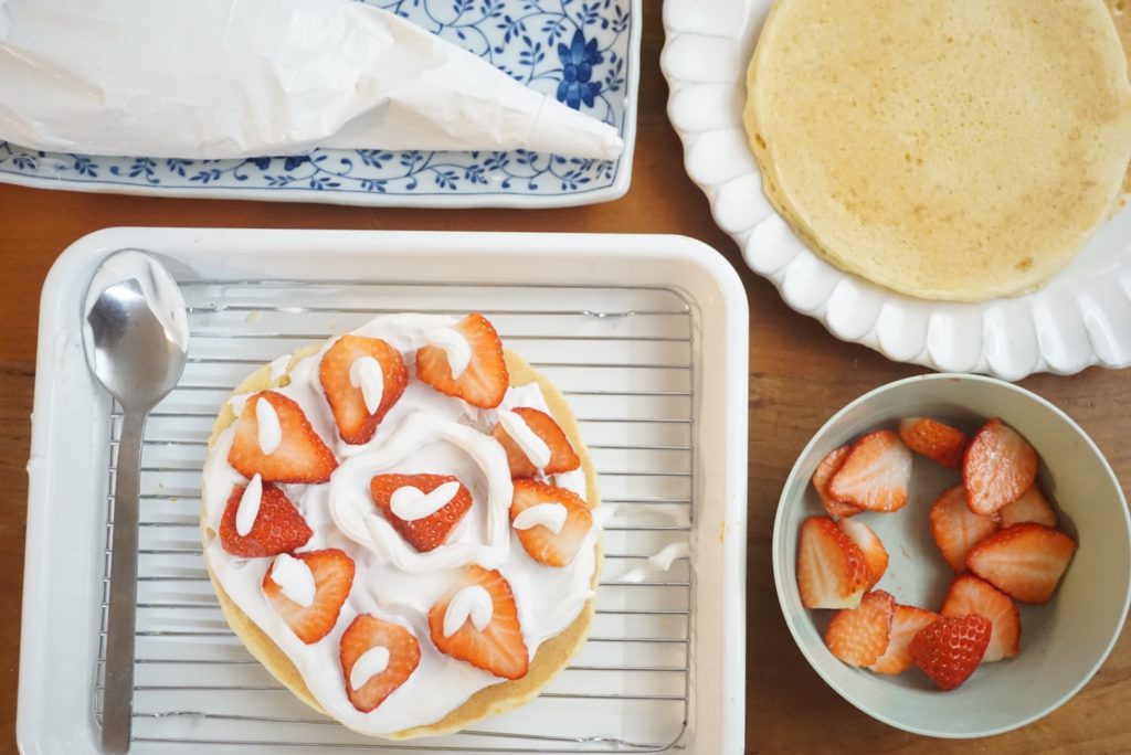 ケーキは、いちごのショートケーキをリクエストされたので、以前みんなの暮らし日記でもご紹介した、おからと米粉のパンケーキを焼いて、と豆乳ホイップで一緒にデコレーション♩