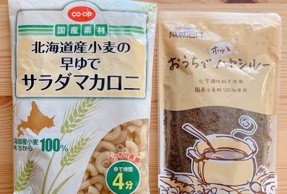 そして、マカロニはコープの国産小麦のマカロニ、ビーフシチューは、成城石井のハヤシライスのルーで作りました。