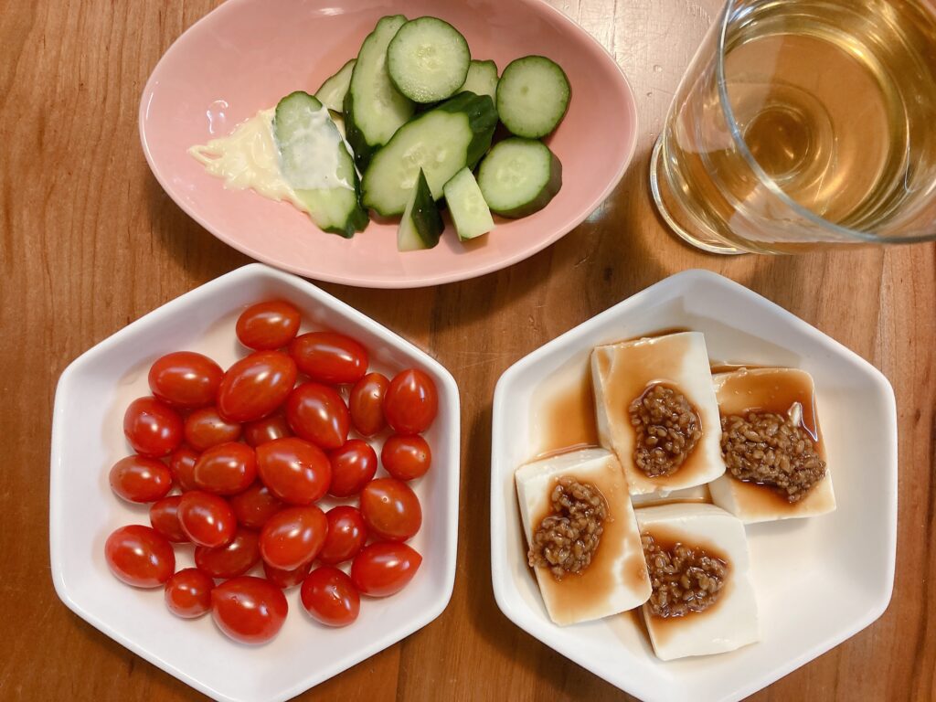 きゅうりを切ってマヨネーズを添えて、お豆腐を切って醤油麹をのせて、トマトを洗って器に盛って。
