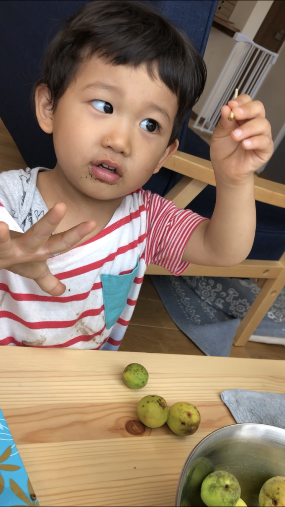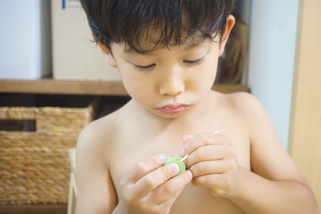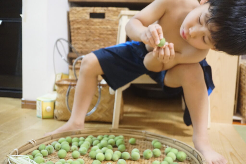 昨日のお風呂あがりに服も着ず、わたしが何も言わずとも、梅のヘタとりをしていた息子。