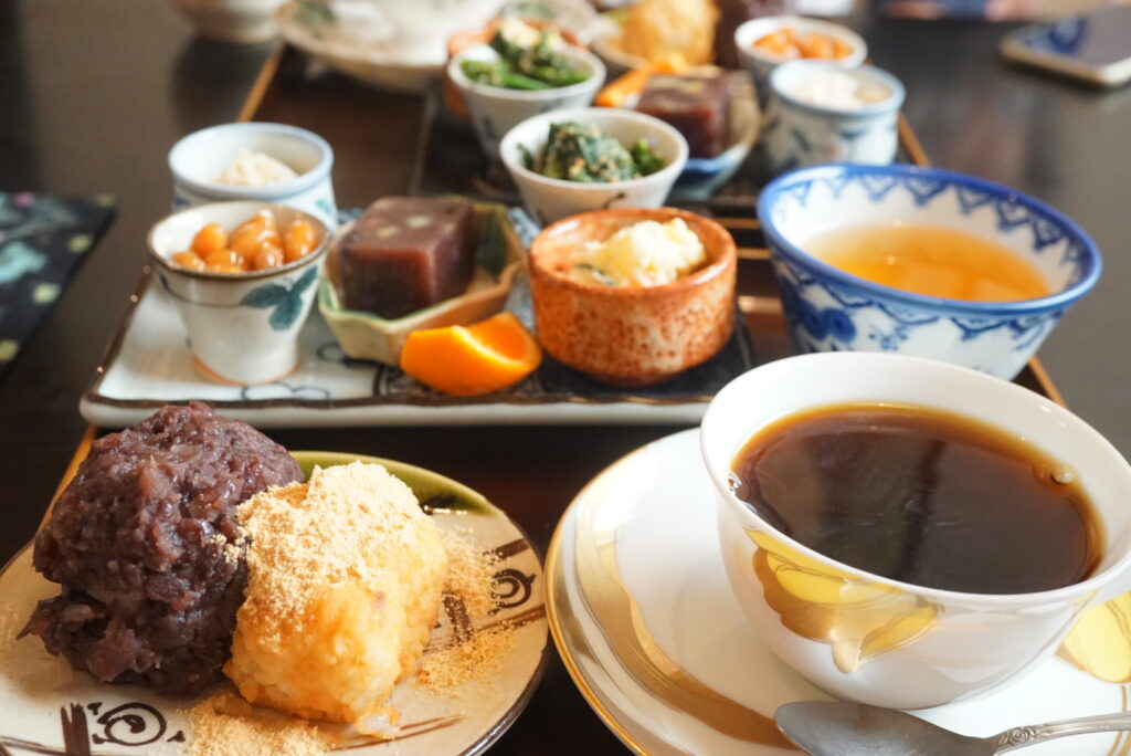 めずらしいおはぎのモーニングで、ワンコインのドリンク代だけで、手作りのおいしいおはぎと、おばんざいがついてきます。