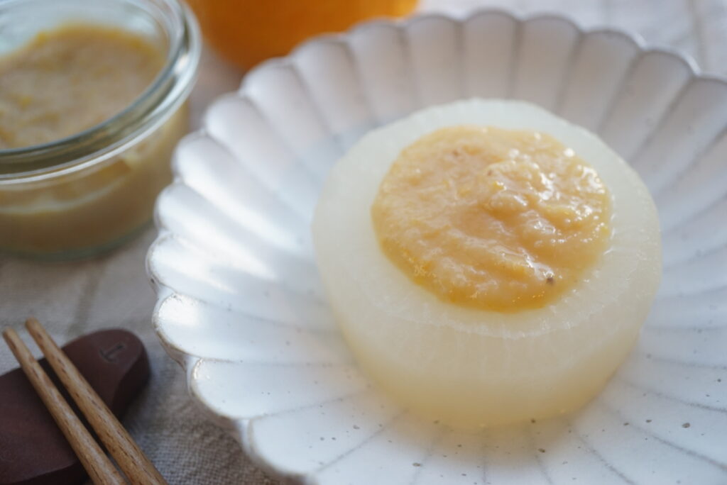 今月は、砂糖不使用&非加熱で作る、甘酒味噌を添えたふろふき大根と、